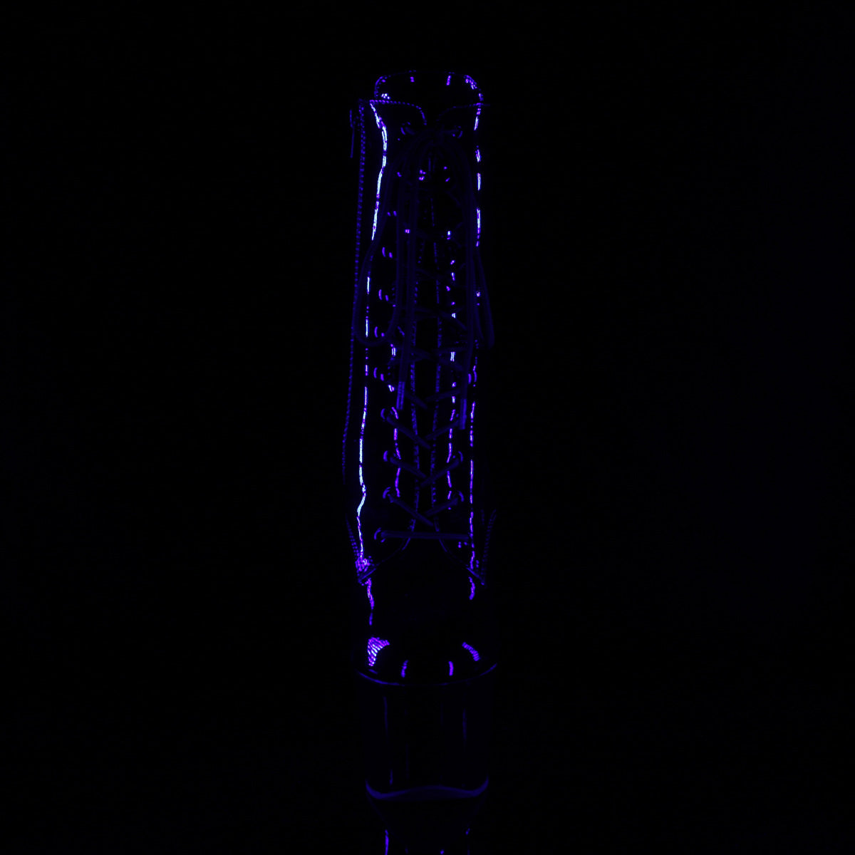 Make a confident entrance with the Sky-1020TT boot, designed to command attention. Its eye-catching 7-inch stiletto heel, paired with a solid 2 3/4-inch platform, offers both height and stability. This two-toned, lace-up boot will draw eyes with every step you take. Under blacklight, the heel and underside of the platform radiate, emitting a brilliant contrasting hue that steals the spotlight. With an inner zip closure, you can easily shift from the limelight to after-hours sophistication.